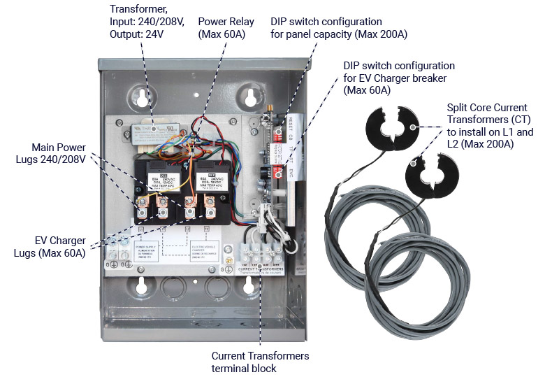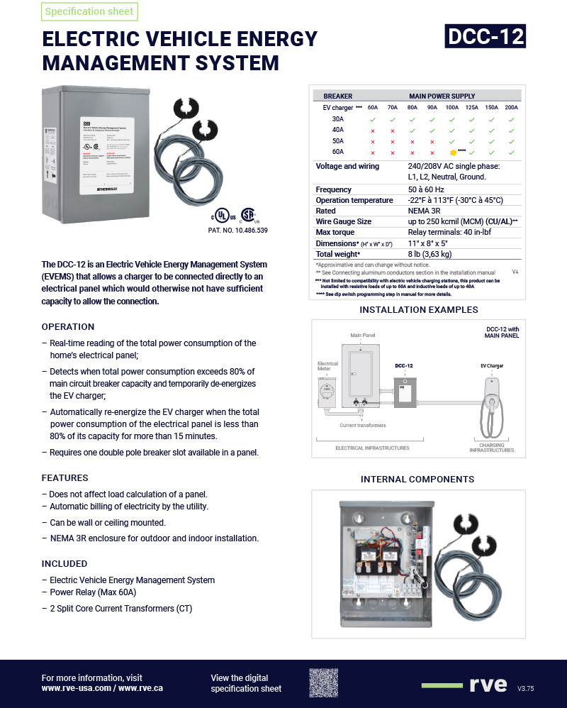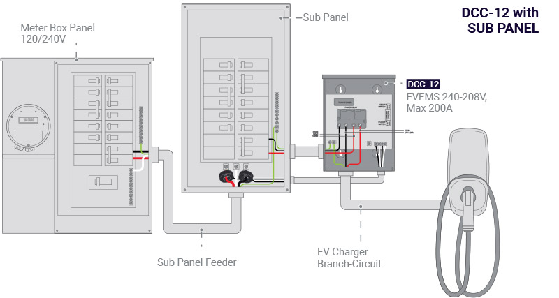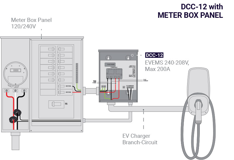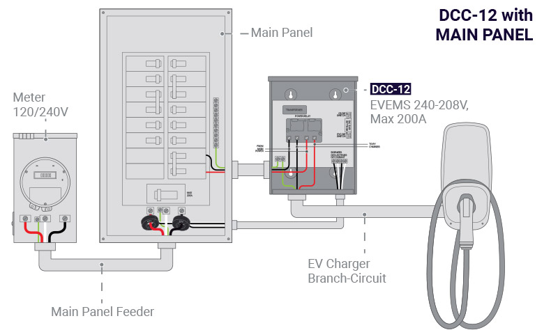 The DCC-12 is an Electric Vehicle Energy Management System (EVEMS) that allows a charger to be connected directly to an electrical panel which would otherwise not have sufficient capacity to allow the connection.